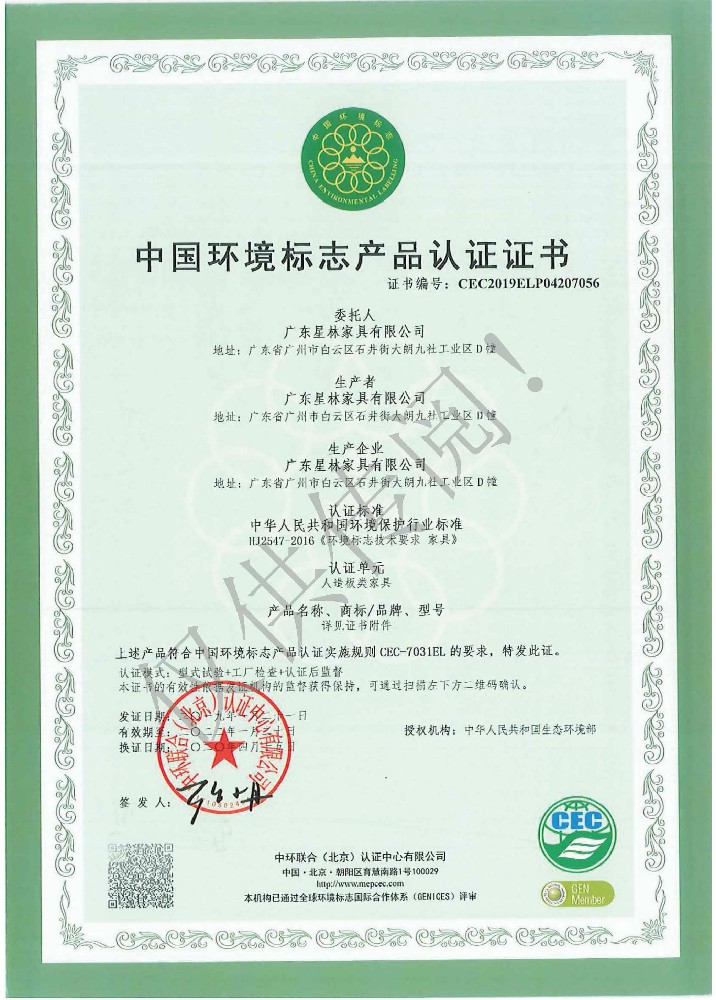 廣東星林家具有限公司創建于家具盛世之期,專業致力于辦公家具、醫療家具、養老家具的開發、設計、生產。公司率先通過ISO9001質量管理體系認證和ISO14001環境管理體系認證及職業健康安全管理體系認證,從而獲得了中環聯合(北京)認證中心有限公司頒發的“中國環境標志產品認證證書(十環認證)”等。